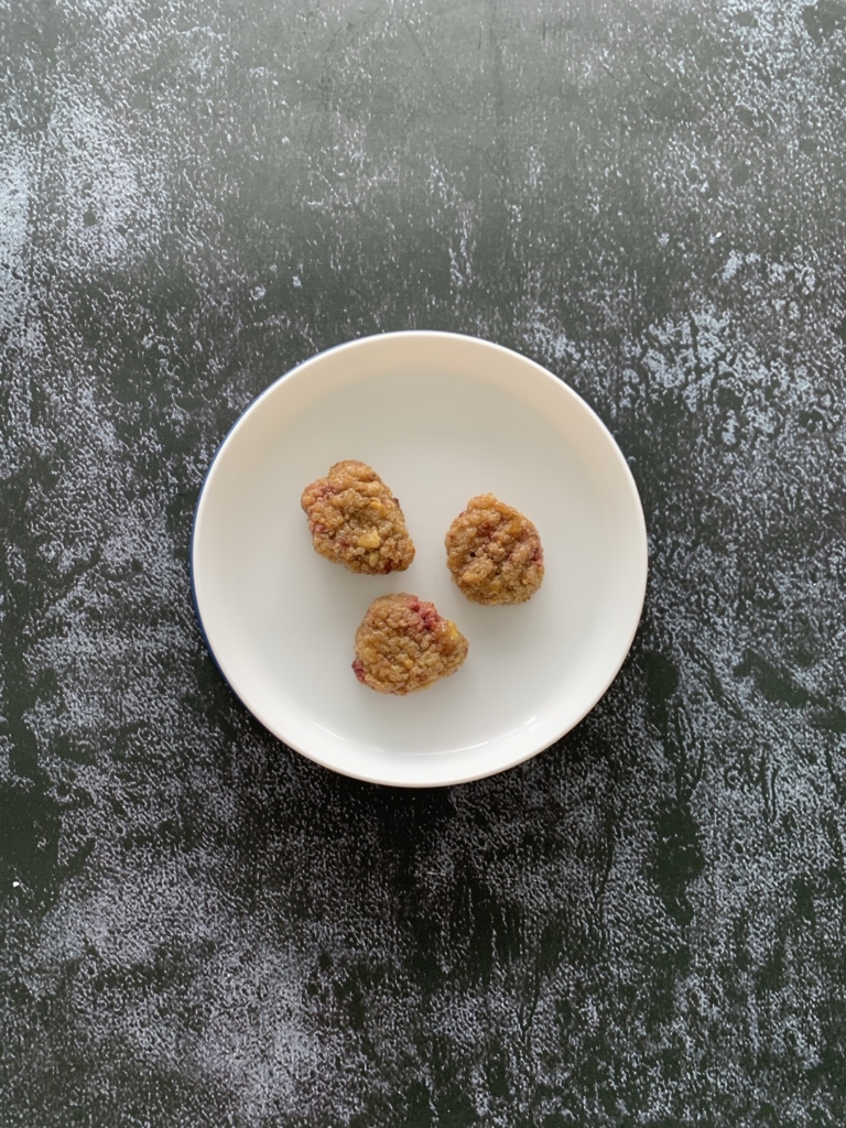 Con Thermomix: Tritura el plátano y la quinoa 7 seg / vel 6. 🍓Agrega las frambuesas y mezcla manualmente. Pincela con aceite de coco un mat de silicona para horno, y agrega una cucharada de la mezcla para formar cada galleta.