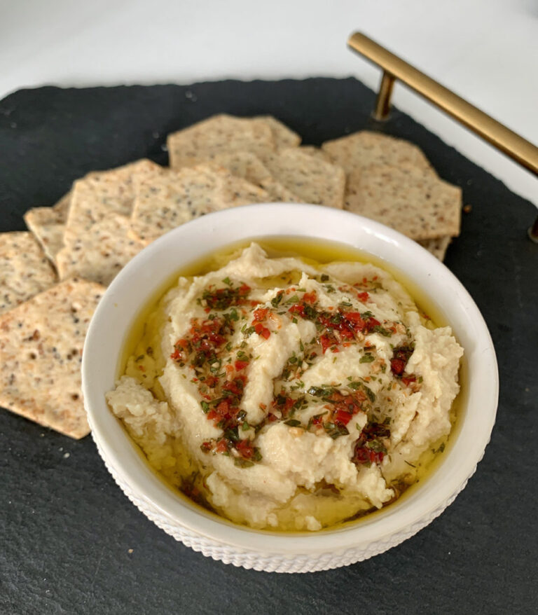 Licúa o lleva a una procesadora todos los ingredientes hasta que obtengas una pasta muy suave y homogénea (sin grumos). Agrega una cantidad generosa de aceite de oliva extra virgen al servirlo.