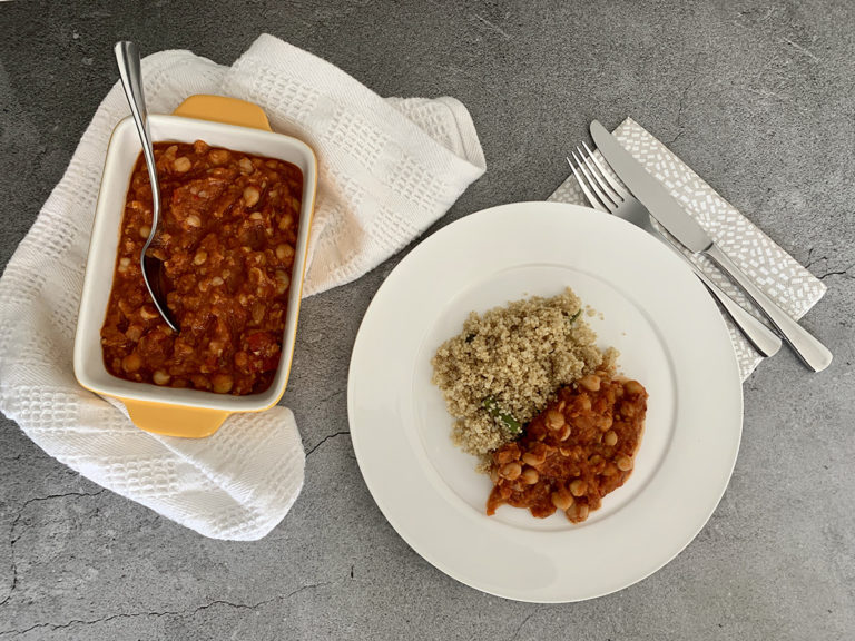 Agregar la salsa de tomate junto a todas las especias y aliños. Revolver bien y añadir los garbanzos. Cocinar hasta que los garbanzos estén calientes, y servir con el acompañamiento que prefieras.